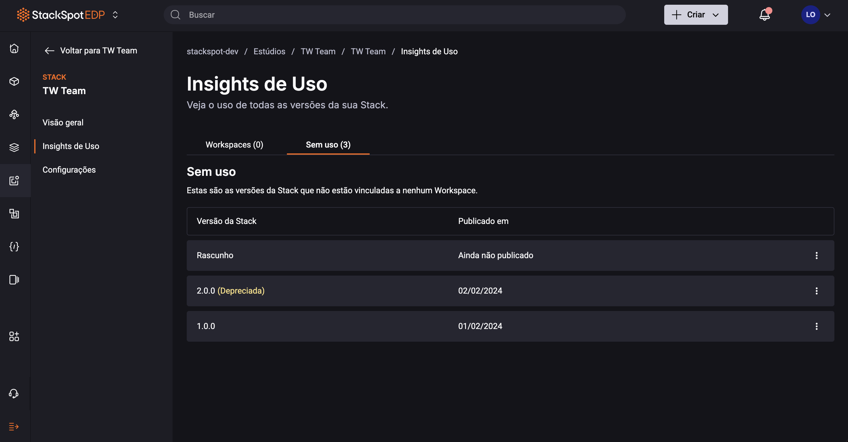 Nesta subseção é possível visualizar quais versões da Stack não estão sendo utilizadas em nenhum Workspace, além da data que em que cada versão foi publicada.