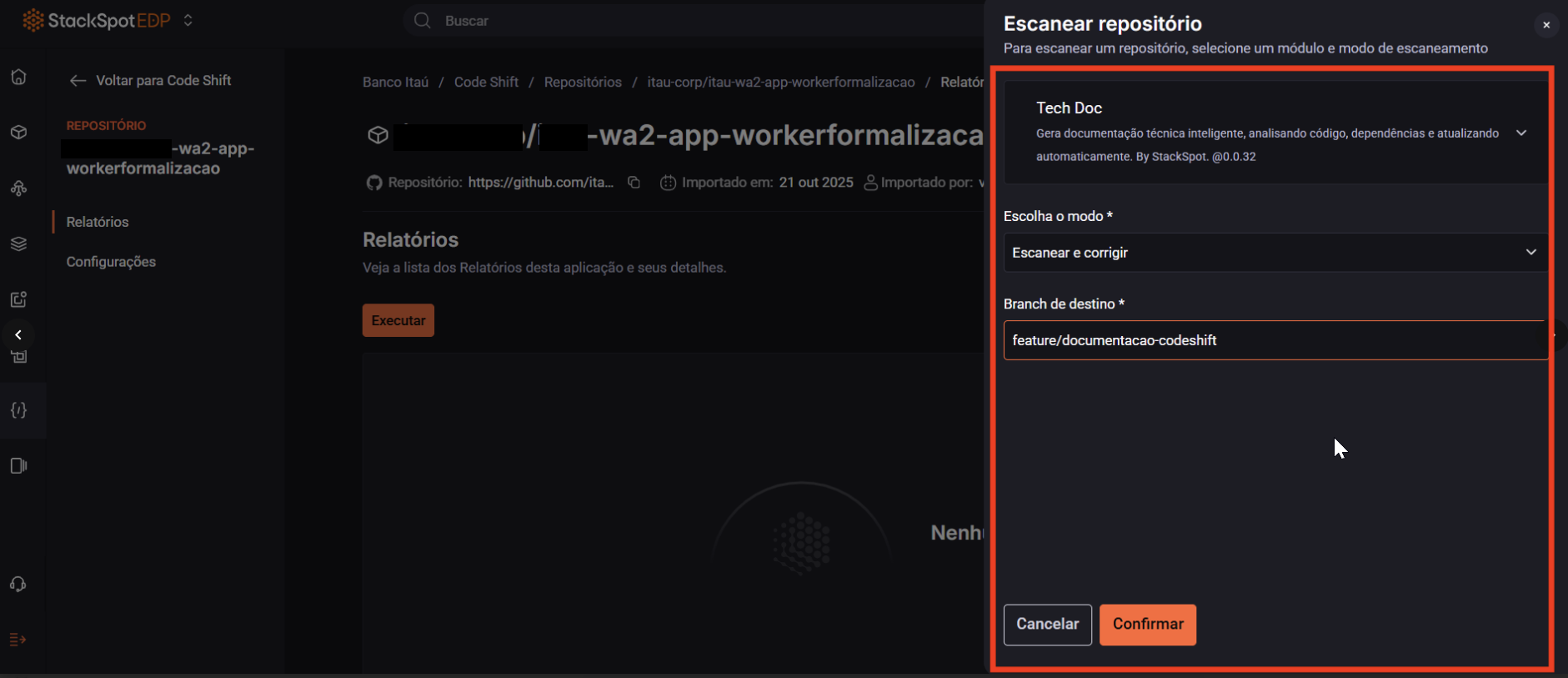 Passo 4. Na Branch de destino, informe o nome da branch que será criada com a documentação. A recomendação é usar: feature/documentacao-codeshift;