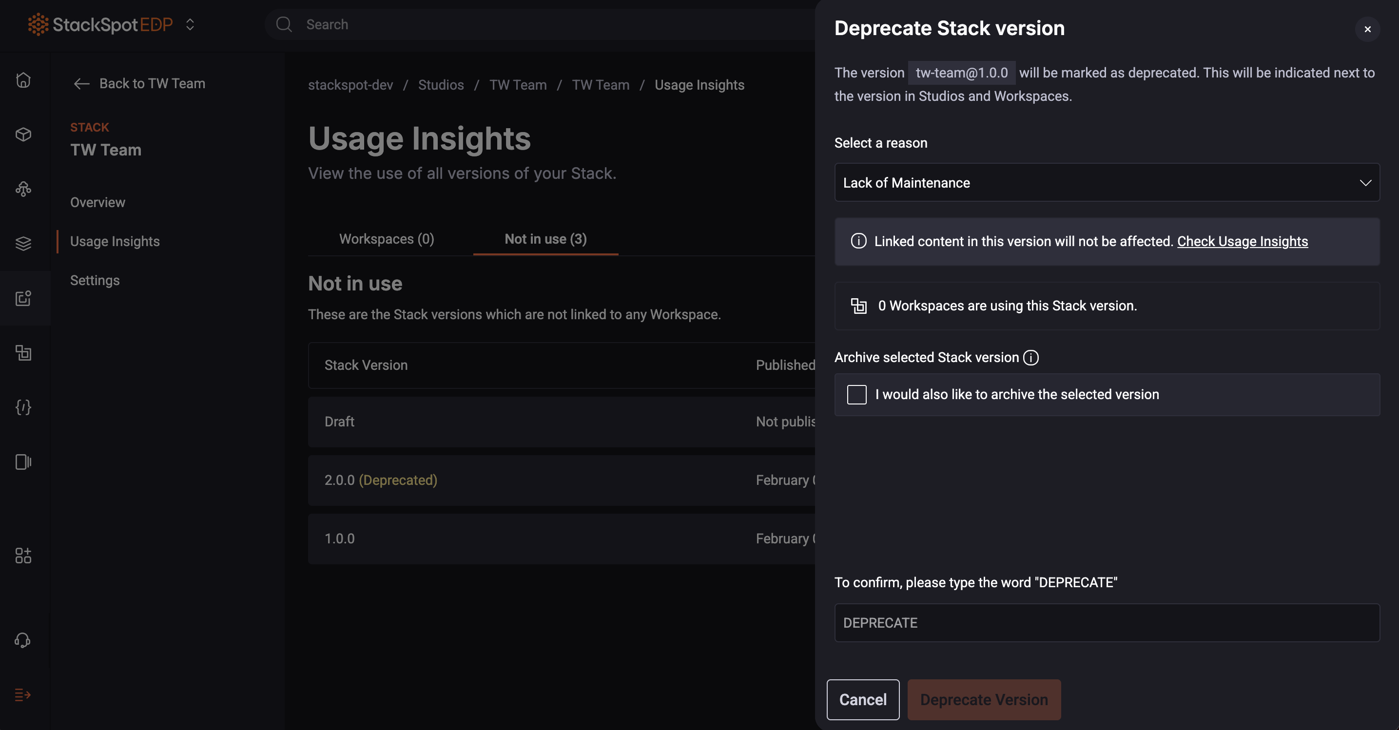 Before deprecating, you can also see which Workspaces are using this Stack version.