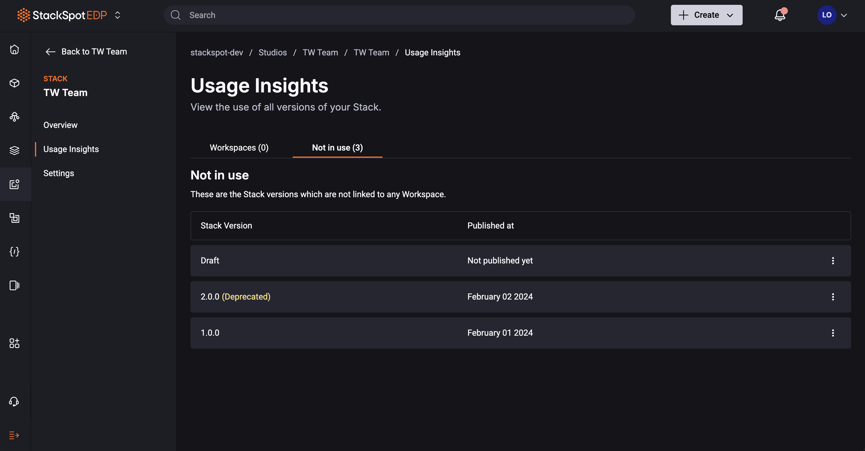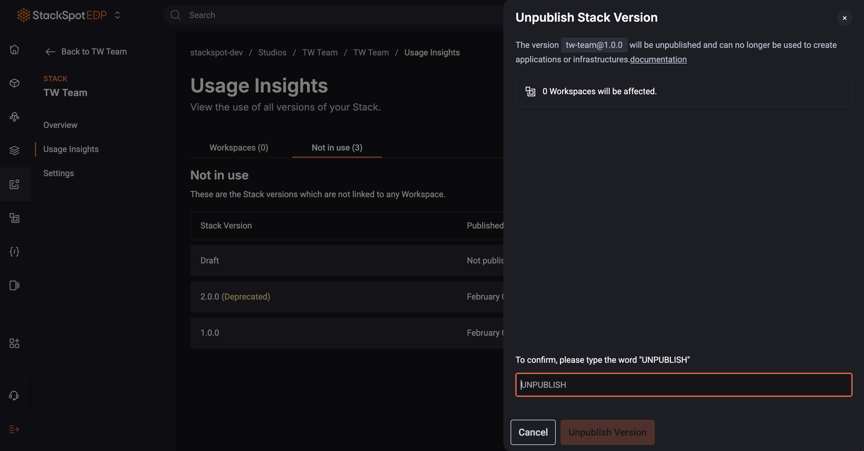 In this subsection, you can see which versions of the Stack are not being used in any Workspace, as well as the date each version was published.