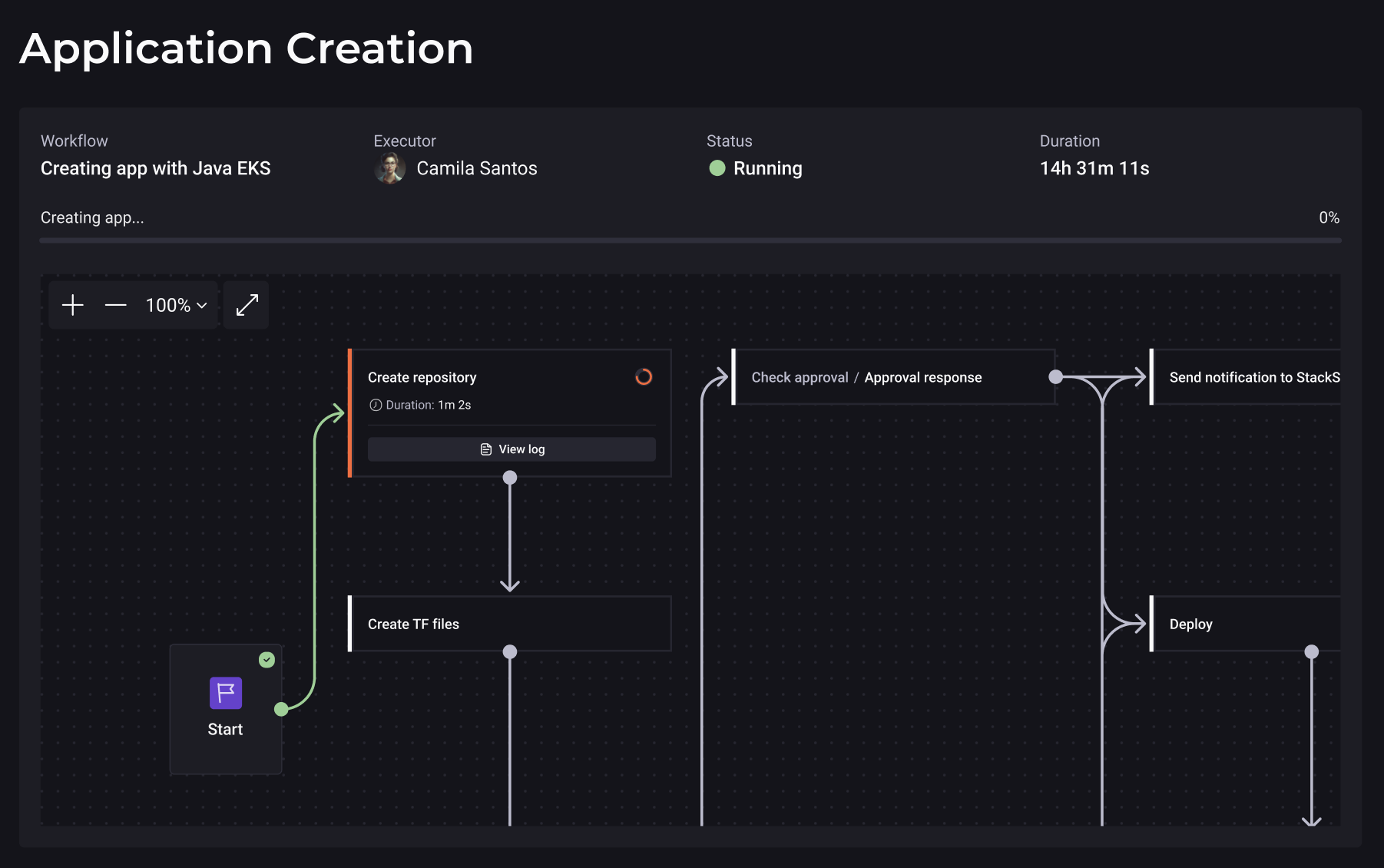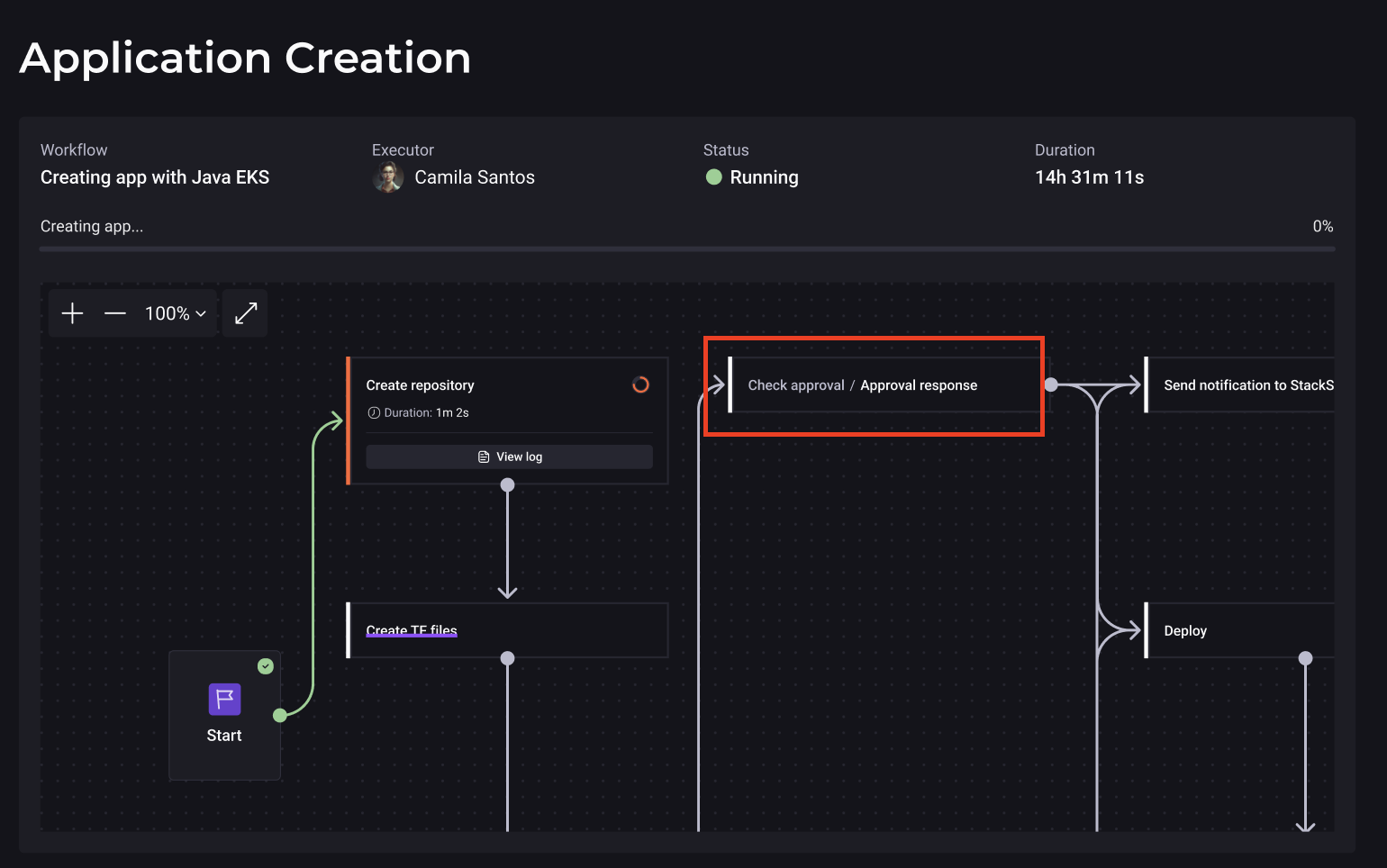 If any Workflow step is paused, it interrupts the display and resumes after approval, showing the details again. When the Application creation is finished, the 'Execution Details' field closes automatically.