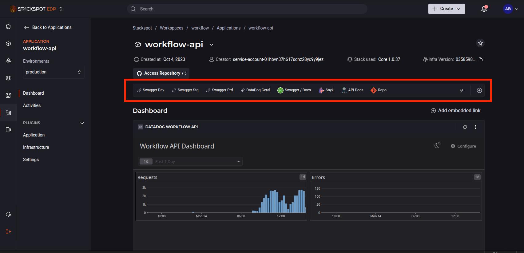 Static Links: They appear at the top of the Application dashboard and redirect the user to the URL. The static links you add in your Workspace, in the Application or Infrastructure section, are available in the application's dashboard.