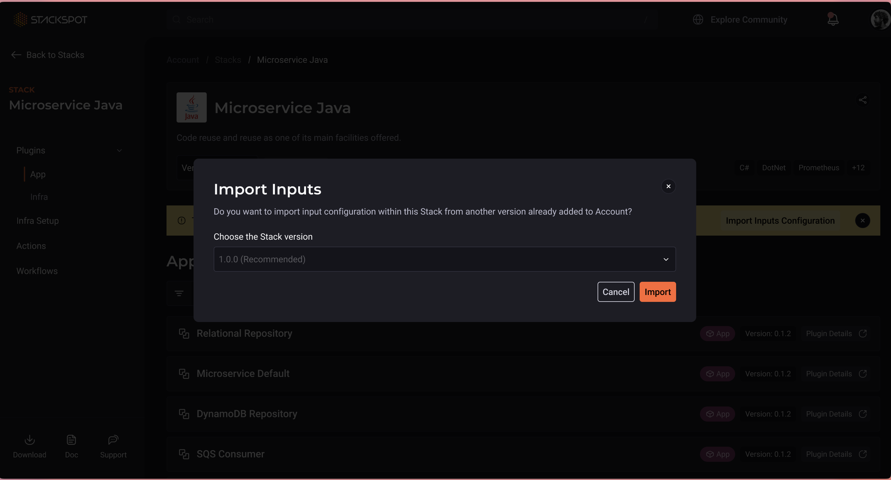 To create Applications or Infrastructures within a Workspace, developers use the available Stacks. When using these Stacks, it is possible to configure the input values of their contents, such as Plugins, Actions, and Workflows.