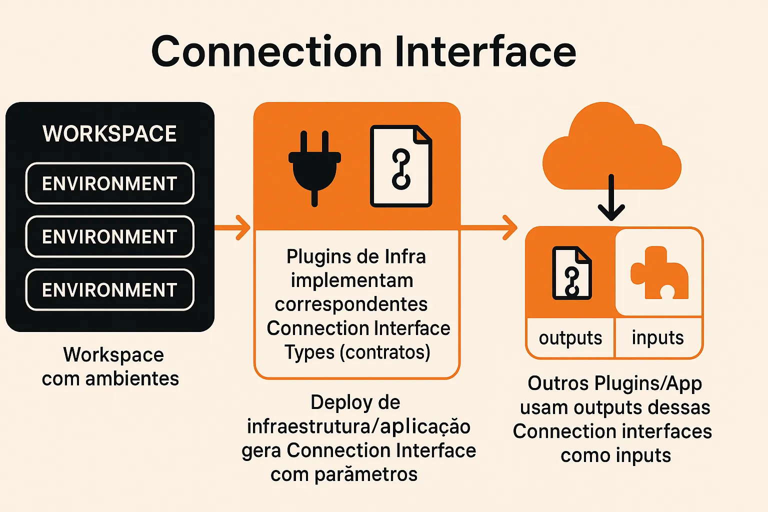 Cada serviço da AWS possui atributos diferentes no cadastro da Connection Interface, criada ao realizar o deploy da Infraestrutura gerada através da plataforma. Dessa forma, qualquer Infraestrutura ou Aplicação compatível com o contrato da Connection Interface pode conectar-se a ela.