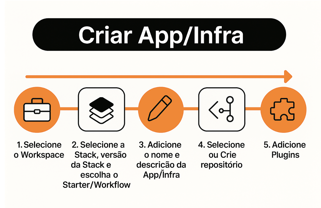 Uma Aplicação (App) e uma Infraestrutura (Infra) são criadas em fluxos com passos similares, como no exemplo a seguir: